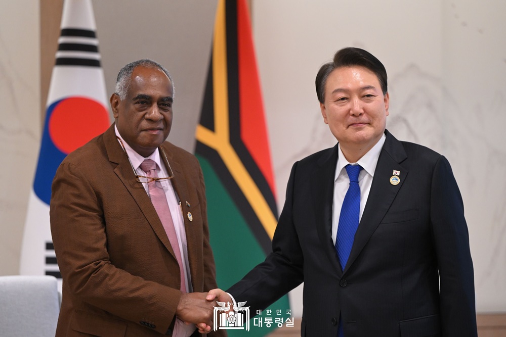 ※ (바누아투) 윤석열 대통령은 기후변화 대응과 관련한 국가의 의무에 관해 ICJ(국제사법재판소)에 권고적 의견을 구하는 유엔총회 결의안(2023. 3월)을 주도하는 등 칼사카우 총리가 보여준 국제적 리더십을 평가하였고, 기후변화와 개발협력 분야에서 협력을 강화해 나가겠다고 했습니다. 칼사카우 총리는 지난 3월 사이클론 피해에 대한 인도적 지원과 전력 공급 사업 등 그간 우리 정부가 행한 다양한 지원에 감사의 뜻을 표하면서, 바누아투가 계획하는 각종 항만개발 사업에 한국이 주도적 역할을 맡아줄 것을 요청했습니다.